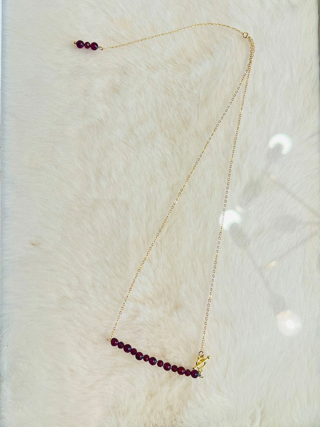 深く艶めくレッドが美しい、モザンビーク産ガーネットを上品にあしらったゴールドネックレス✨ 陽の光を受けるたびに、ワインのような奥行きある輝きを放ち、 身につける人の魅力を内側から引き出します✨ モザンビーク産ガーネットは、世界でも特に発色と透明度に優れた高品質のストーン。 「情熱」「生命力」「愛の絆」を象徴する石として知られ、 自分らしく生きる力と前向きなエネルギーを与えてくれる存在です。 シンプルながらも印象的なスタイルで “心にそっと情熱を灯すような”アクセサリーとしておすすめの一本です✨ マグネットクラスプで脱着がカンタン♪♬ 【仕様】 ・1粒サイズ・・・4mm ・ネックレスの長さ・・・約38cm 無理に引っ張ると破損する可能性がございます。 衣類やバッグへの引っかかりにご注意ください。 ーーーーーーーーーーーーーーーー 【注意書き】 ・金属アレルギーについて こちらの商品は金属アレルギーに対応しておりません。アレルギー反応が出る可能性があるため、異変を感じた場合はすぐに使用を中止してください。 ・子どもやペットの誤飲について 小さな子どもやペットが誤飲する可能性があるため、使用しないときは手の届かない所に保管してください。誤飲に関しては責任を負い兼ねます。ご了承ください。 ・キャンセル、返品、交換について キャンセル、返品、交換は基本的にお受けしていません。ただし、商品到着後3日以内にご連絡をいただいた場合、破損や不備に関しては事情を確認後、無料で対応させていただきます。