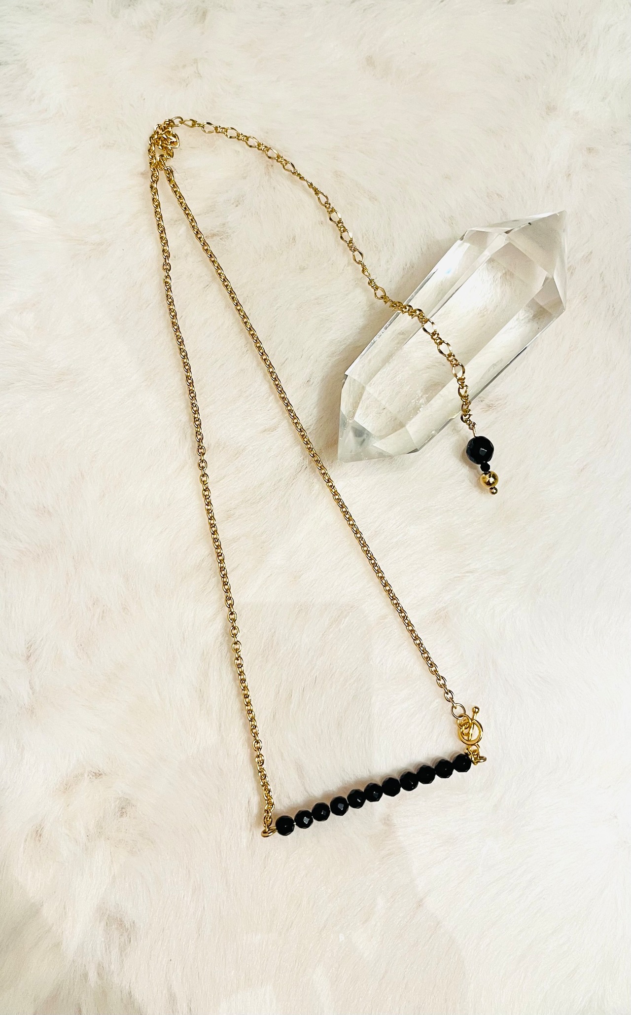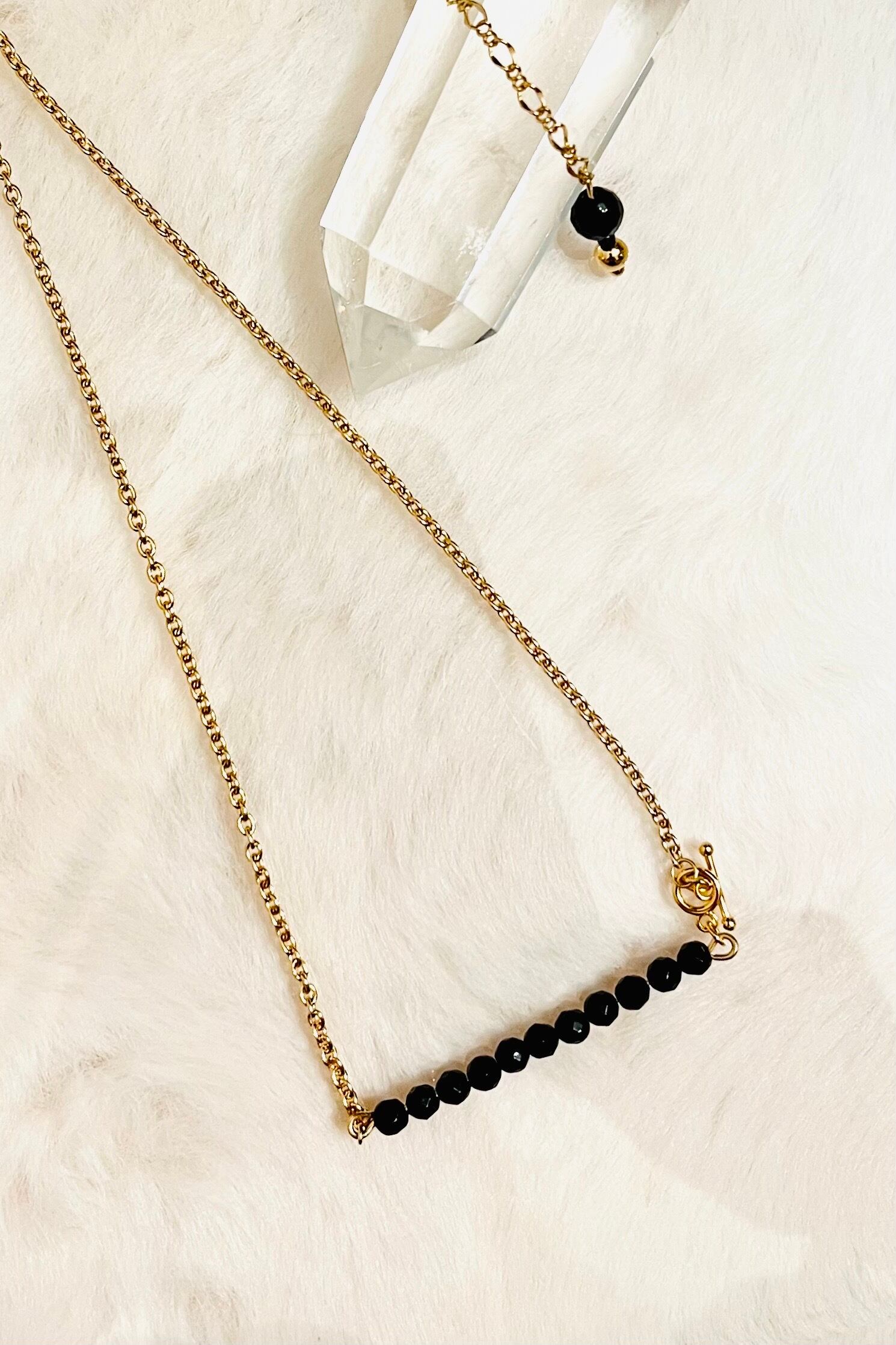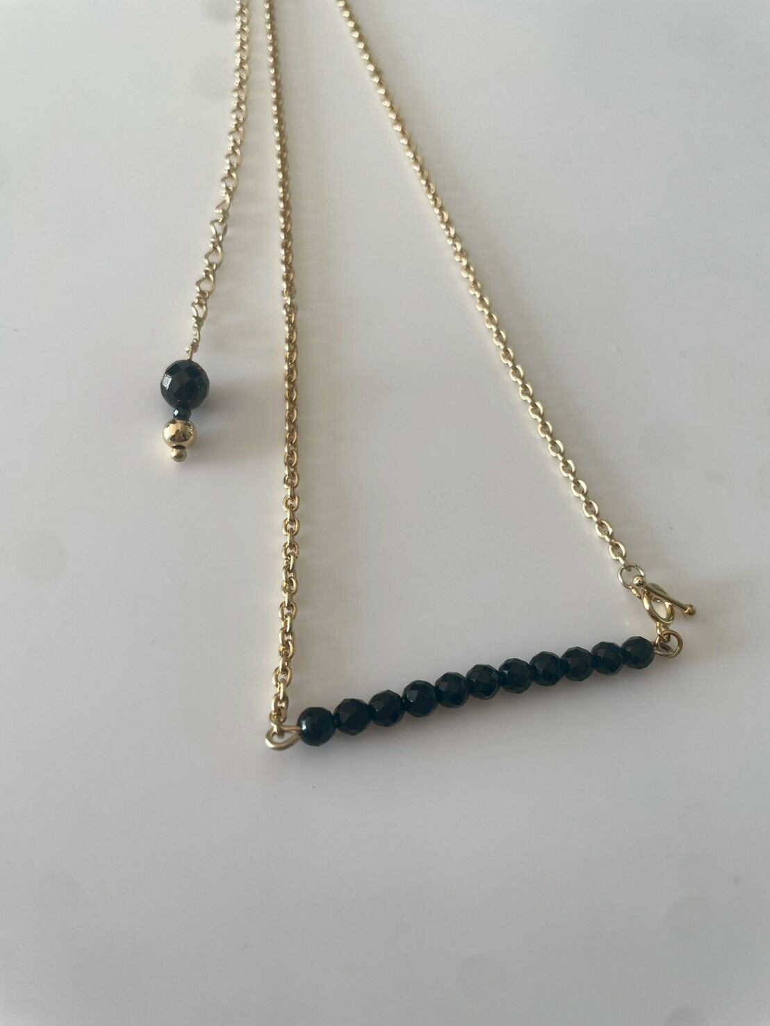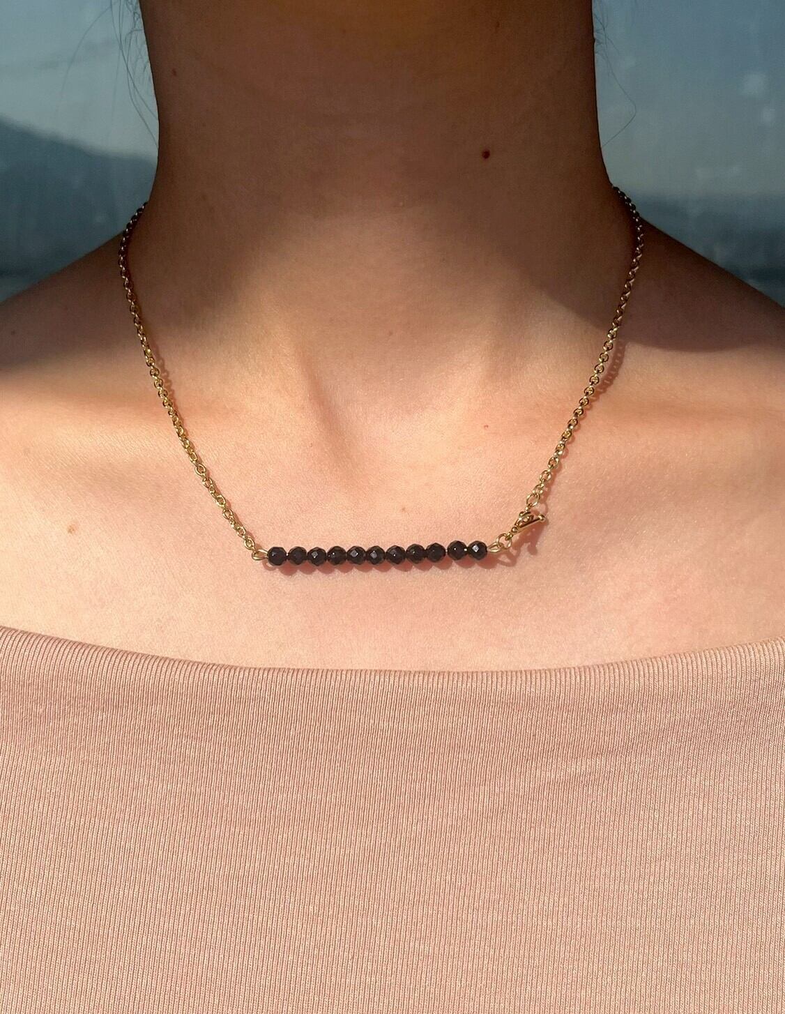 漆黒に輝くブラックスピネルを繊細なゴールドチェーンでつなぎ、