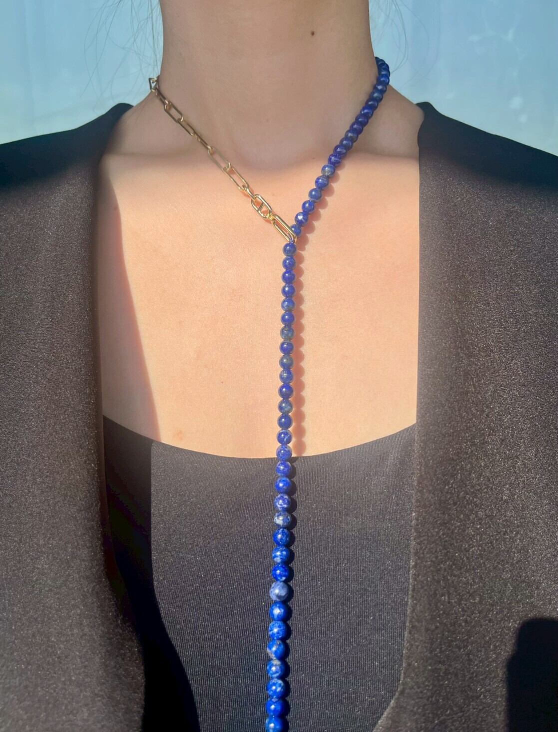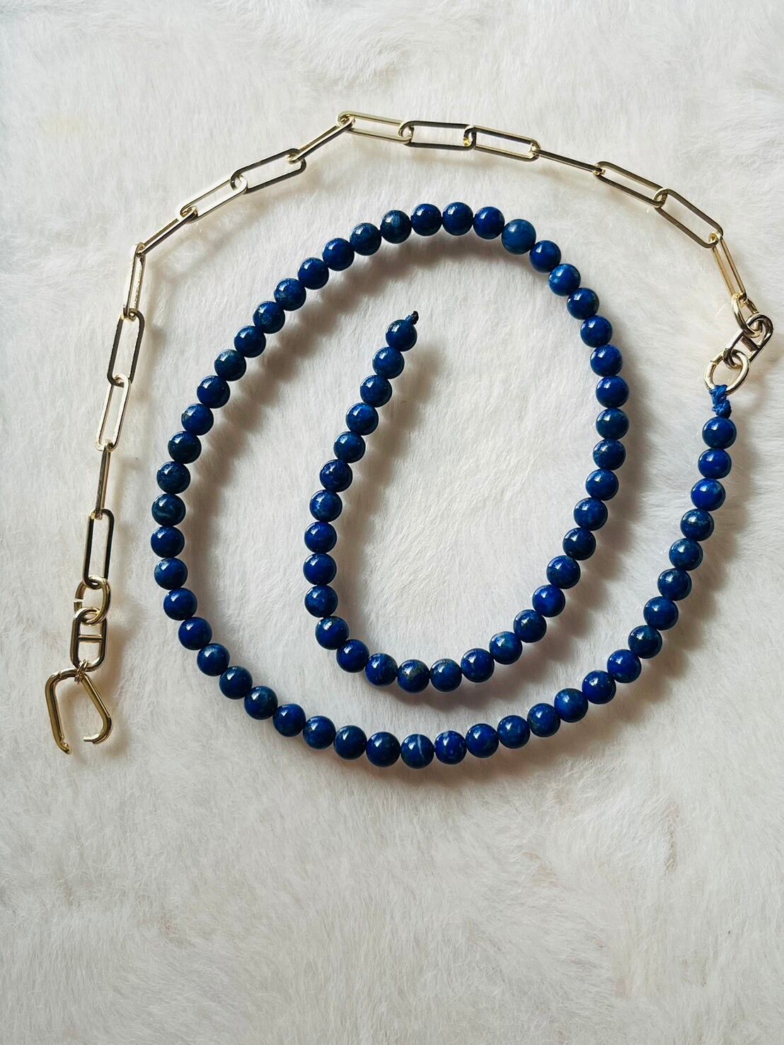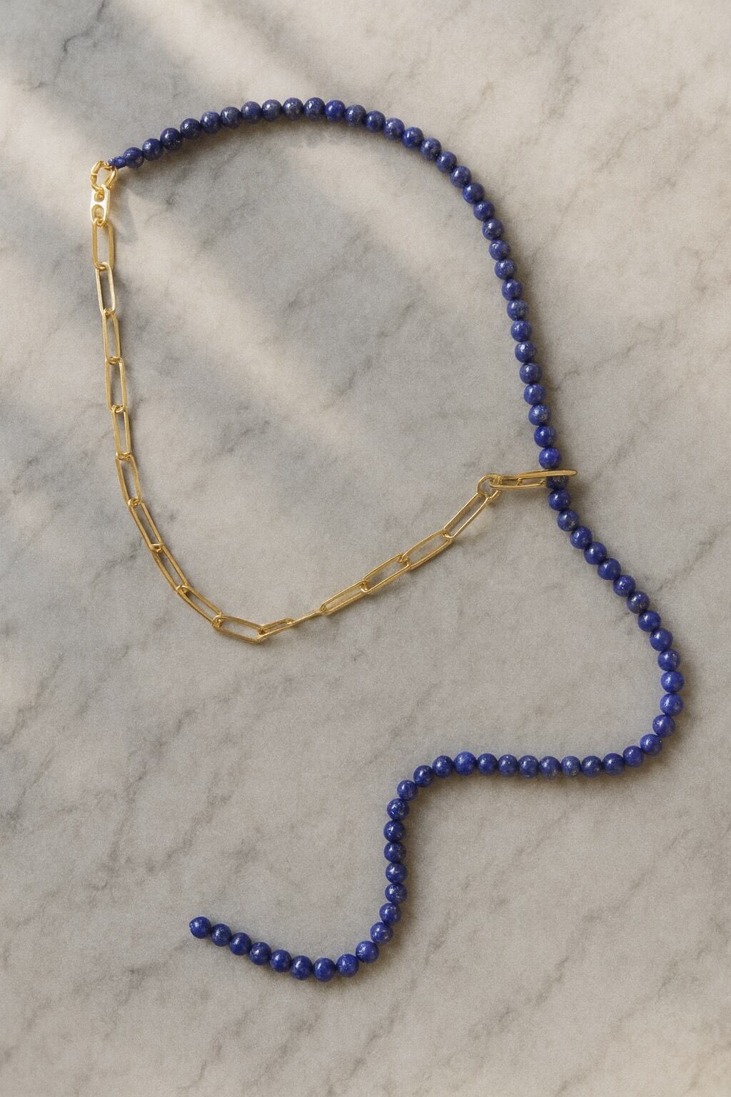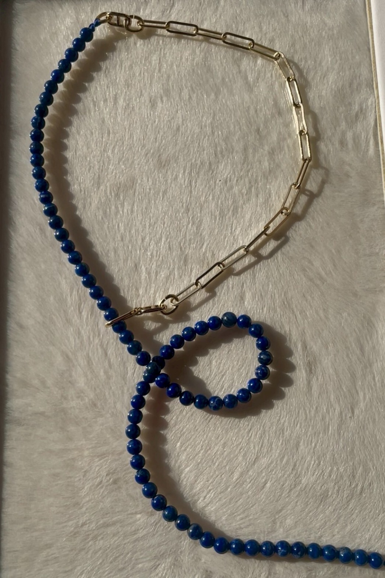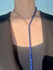 気品あるブルーの天然石を、華やかなゴールドチェーンでつなぎ、