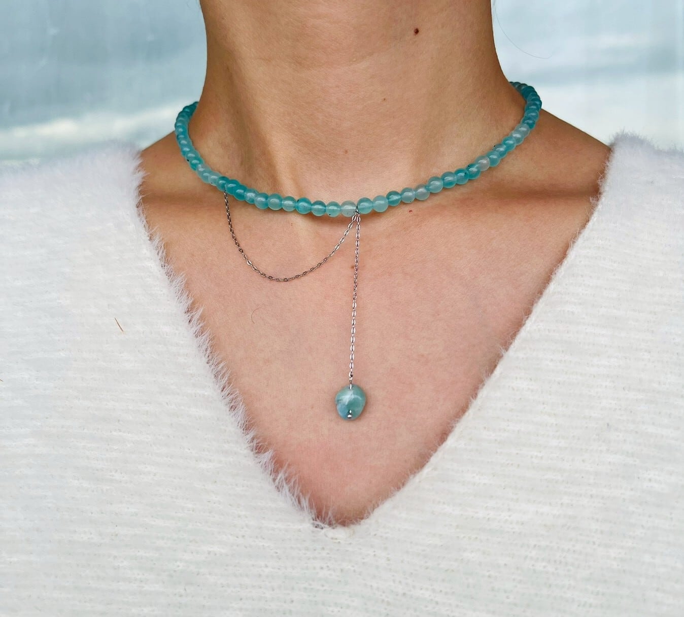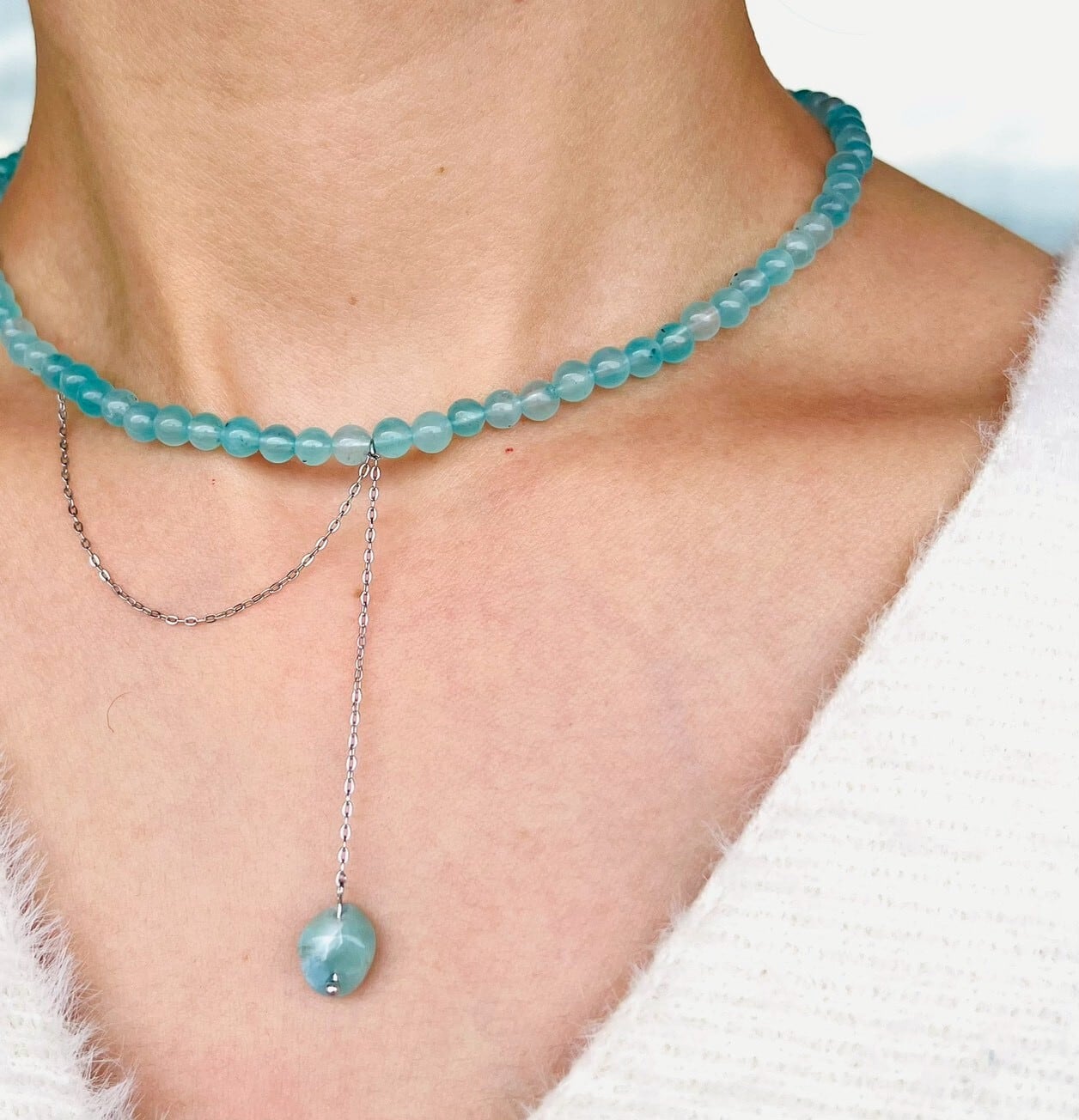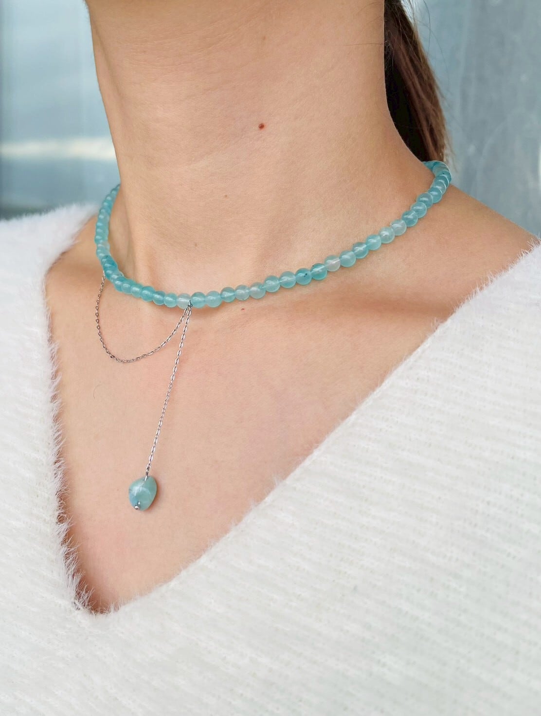 やさしいミルキーブルーのシーブルーカルセドニーが首元をやわらかく包み込み、