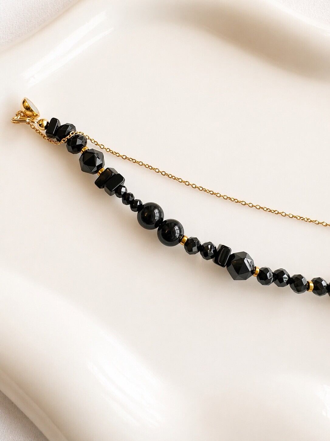 さまざまな形・サイズのオニキスとブラックスピネルをランダムに組み合わせた、