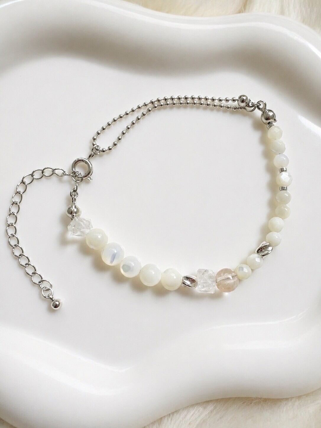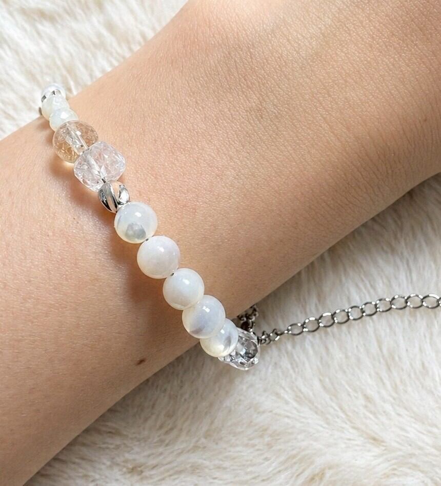 やさしい乳白色が魅力のホワイトシェルをベースに、ラフロッククォーツとルチルクォーツをアクセントにしたブレスレットです♡