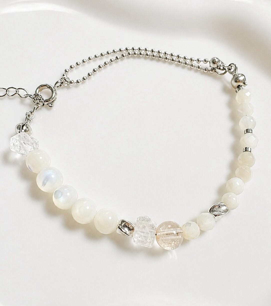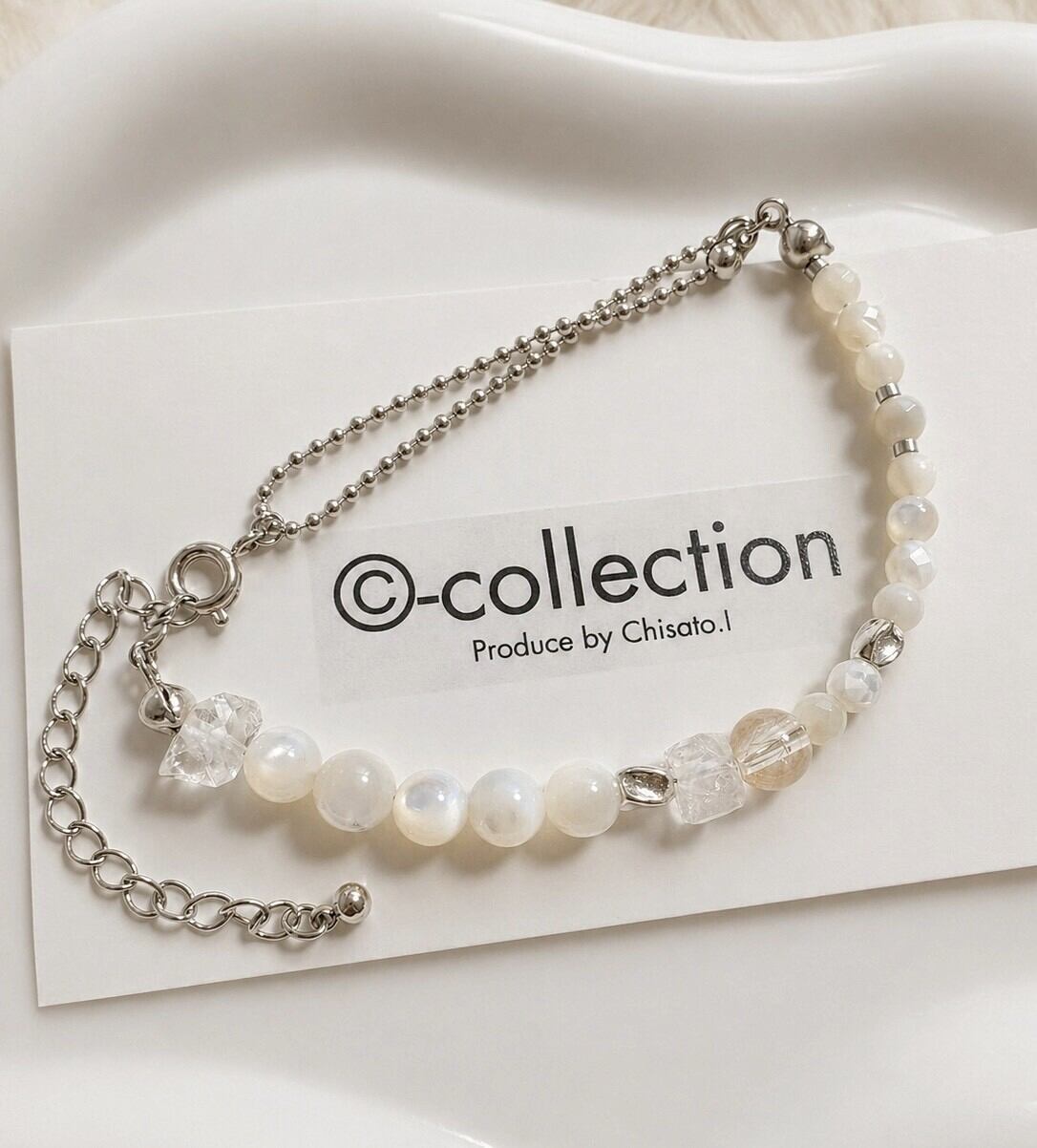 ラフロッククォーツのナチュラルな質感と、ルチルクォーツのほんのり輝く透明感がポイントで、全体的に白でまとめて大人可愛い仕上がりです♡